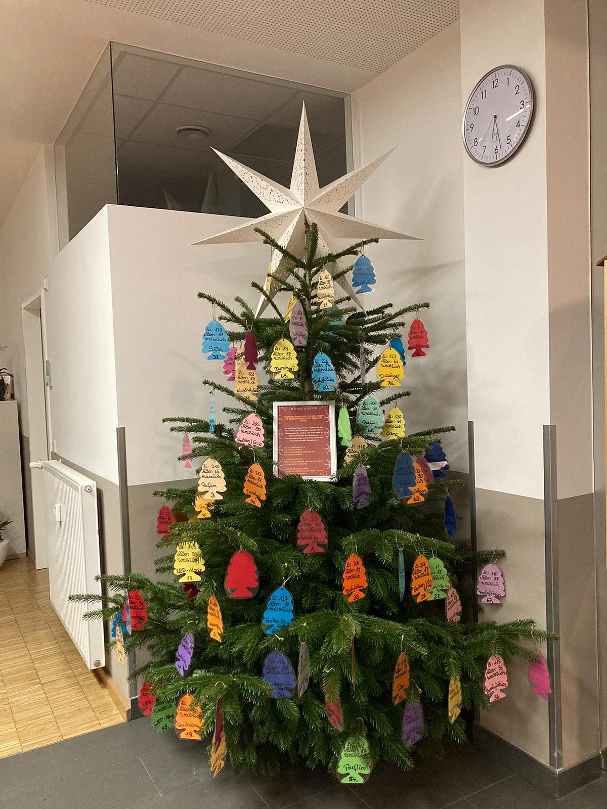 In unserem ambulanten Rehazentrum wurde ein großer Christbaum aufgestellt. An ihm hängen viele kleine Wunschkärtchen mit Weihnachtswünschen.